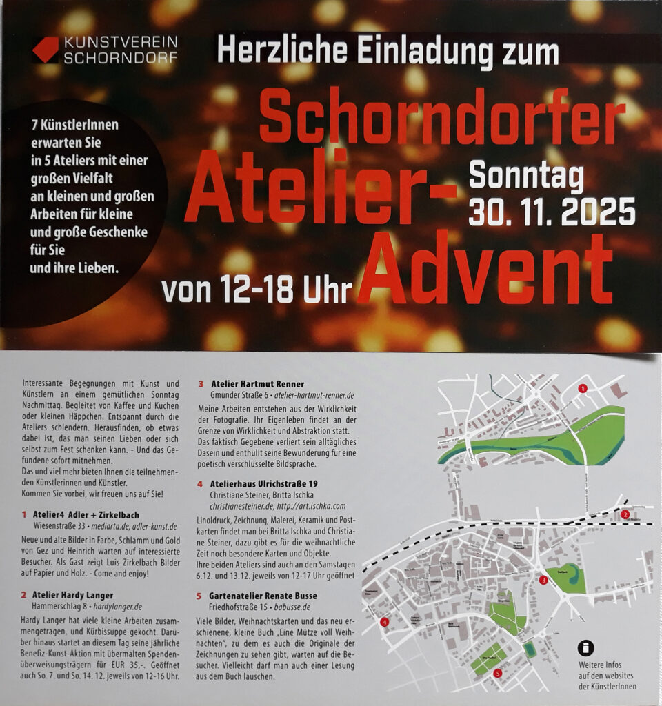 unsere Ateliers im Atelierhaus Ulrichstr.19 in 73614 Schorndorf sind auch an den Samstagen 6.12. und 13.12. jeweils von 12-17 Uhr geöffnet